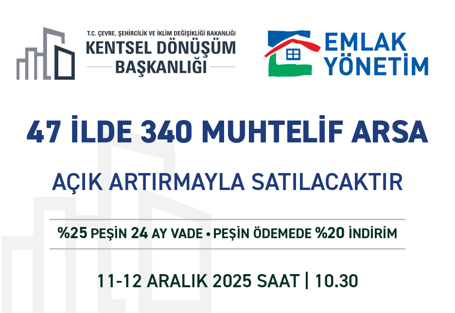 Kentsel Dönüşüm Başkanlığı tarafından 47 ilde yer alan 340 muhtelif arsa, açık artırma yöntemiyle satışa sunulacaktır. Yatırımcılar için avantajlı ödeme koşulları ve geniş seçenekler sunulan müzayedeye hem fiziki hem de online olarak katılım mümkündür.