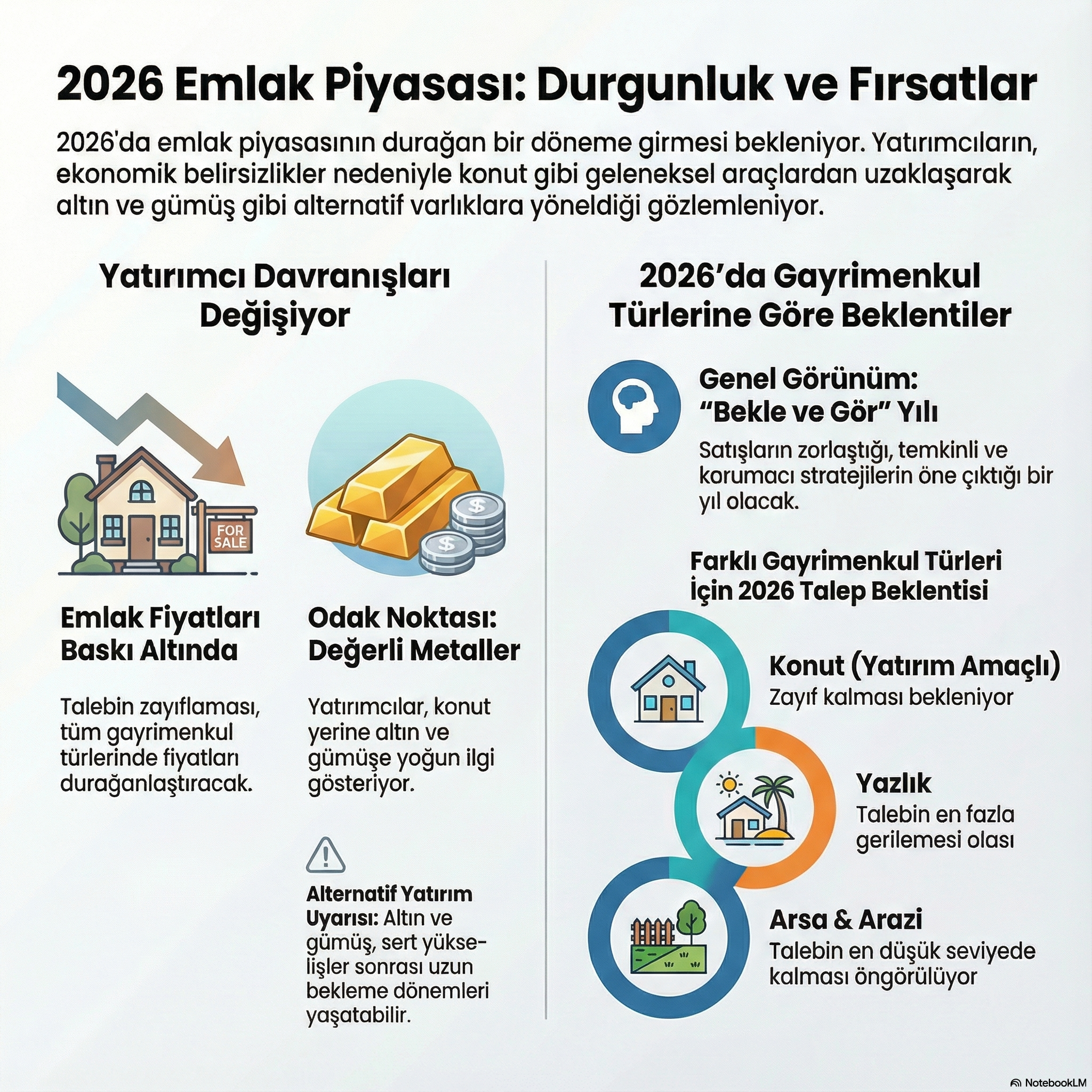 2026 yılına girilirken gayrimenkul piyasasına ilişkin beklentiler, yatırımcıların odağının konuttan uzaklaşarak alternatif enstrümanlara yöneldiğine işaret ediyor. Mevcut ekonomik koşullar, küresel belirsizlikler ve bireysel yatırım tercihlerindeki değişim, önümüzdeki yılın emlak sektörü açısından zor ve durağan geçeceğini gösteriyor.
