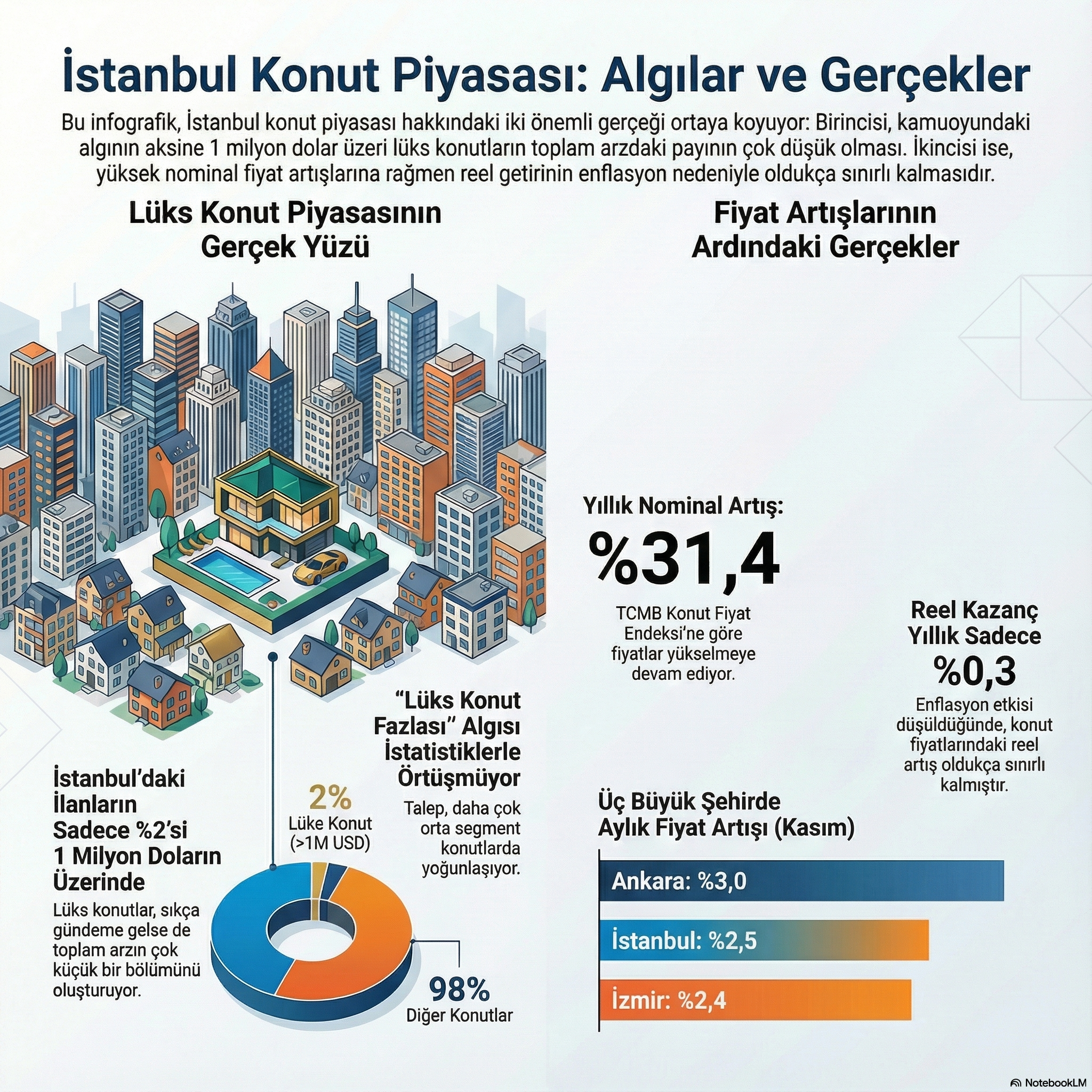 Uzman değerlendirmelerine göre, İstanbul’da yüksek fiyatlı konutların düşük paya sahip olması; gelir dağılımı, finansmana erişim zorlukları ve talebin daha çok orta segmentte yoğunlaşmasıyla ilişkilendiriliyor. Bu durum, kamuoyunda sıkça konuşulan “lüks konut fazlalığı” algısının, istatistiksel verilerle tam olarak örtüşmediğini gösteriyor.