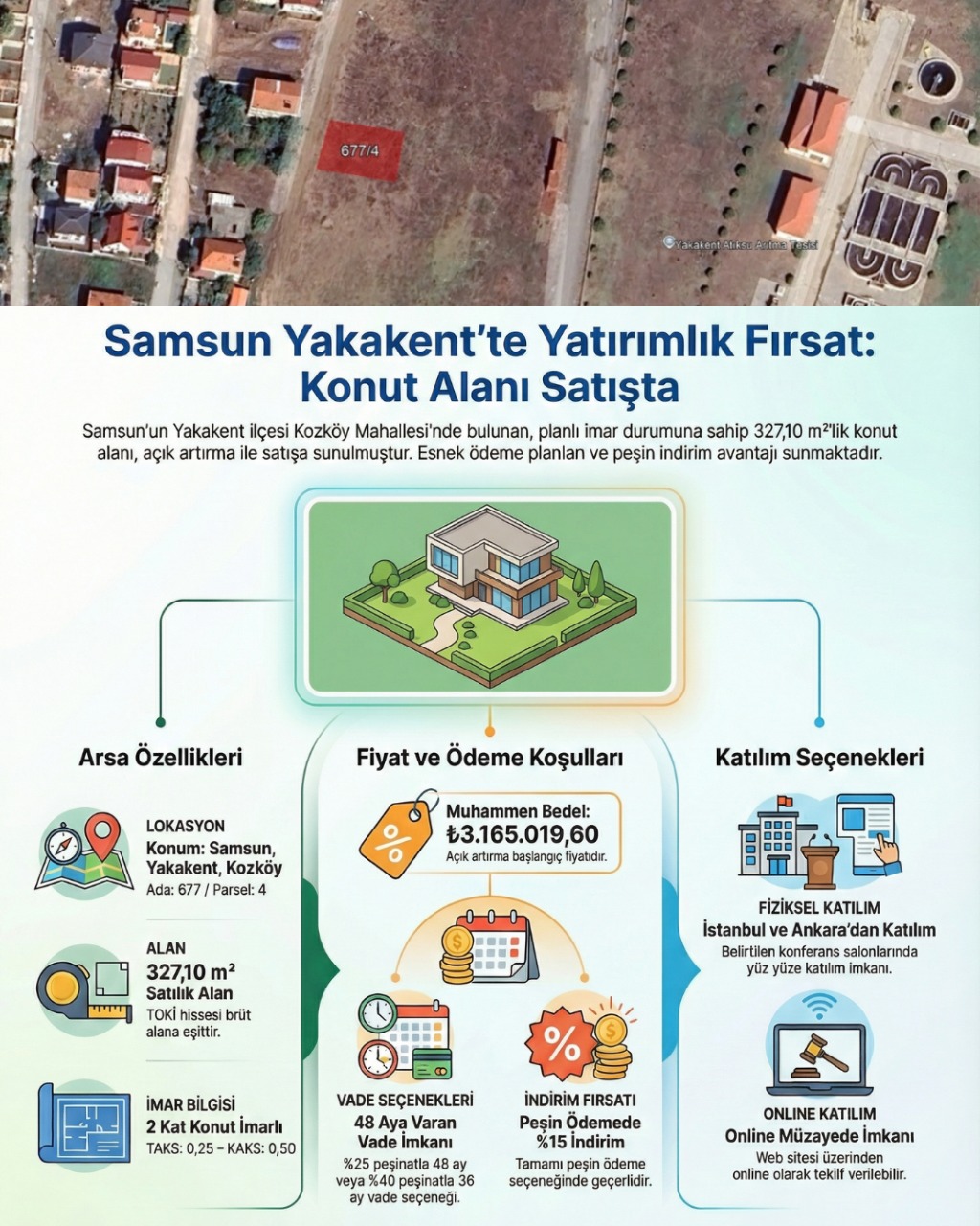 Samsun’un Yakakent ilçesi Kozköy Mahallesi’nde yer alan bu konut alanı, planlı imar yapısı ve esnek ödeme seçenekleriyle yatırımcıların ilgisine sunulmaktadır.